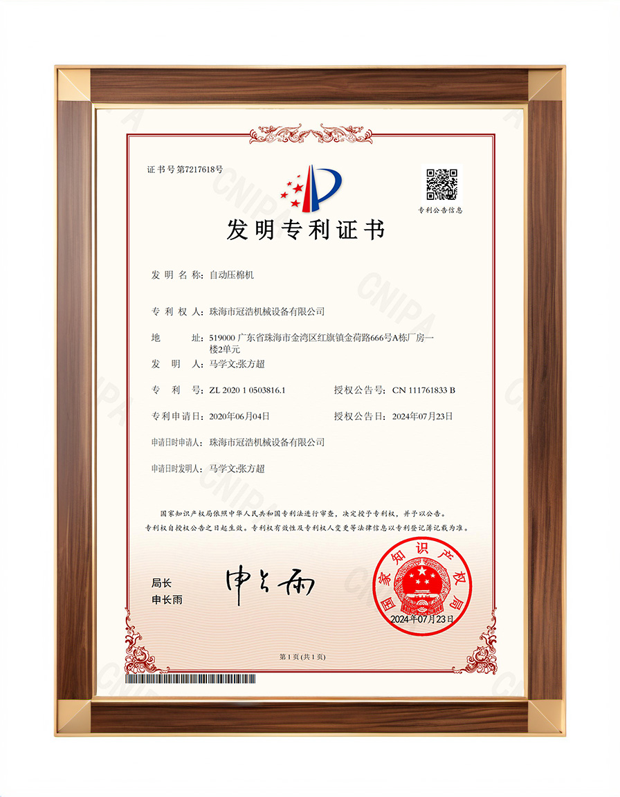 珠海冠浩負責人馬總表示:“獲得發明專利證書,是對我們研發團隊辛勤工作的肯定,也是珠海冠浩創新實力的體現。我們將繼續加大研發投入,不斷推出更多高效、智能的設備,為客戶創造更大價值。” 珠海冠浩此次獲得的發明專利證書,不僅增強了公司在市場中的競爭力,也為企業未來的發展奠定了堅實基礎。未來,冠浩公司將繼續以科技創新為驅動力,致力于推動行業進步,為客戶提供更優質的解決方案。